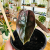 Alocasia Cuprea, also known as Alocasia "Red Secret", is a tropical plant native to the rainforests of Borneo. It is distinguished by its spectacular leaves, which are thick, metallic, and have a coppery or reddish appearance, giving it an almost alien appearance. The leaves are heart-shaped and can reach an impressive size. The surface of the leaves is shiny and often marked with deep, contrasting veins.