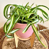 Chlorophytum 'Bonnie' is a more compact and elegantly curled version of the classic spider plant. Its long, cream-edged green leaves unfurl in dynamic spirals, forming a vibrant cloud of vegetation. Both graphic and easy to care for, it's perfect for a hanging basket or as a bright centerpiece.