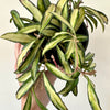Le Hoya Wayetii 'Tricolor' est une plante tropicale remarquable pour son feuillage élancé, caractérisé par des feuilles étroites avec des nuances de vert, de rose et de crème. En période de floraison, cette variété produit des fleurs en grappes, petites et cireuses, avec une teinte rosée ou pourpre et un parfum délicat.